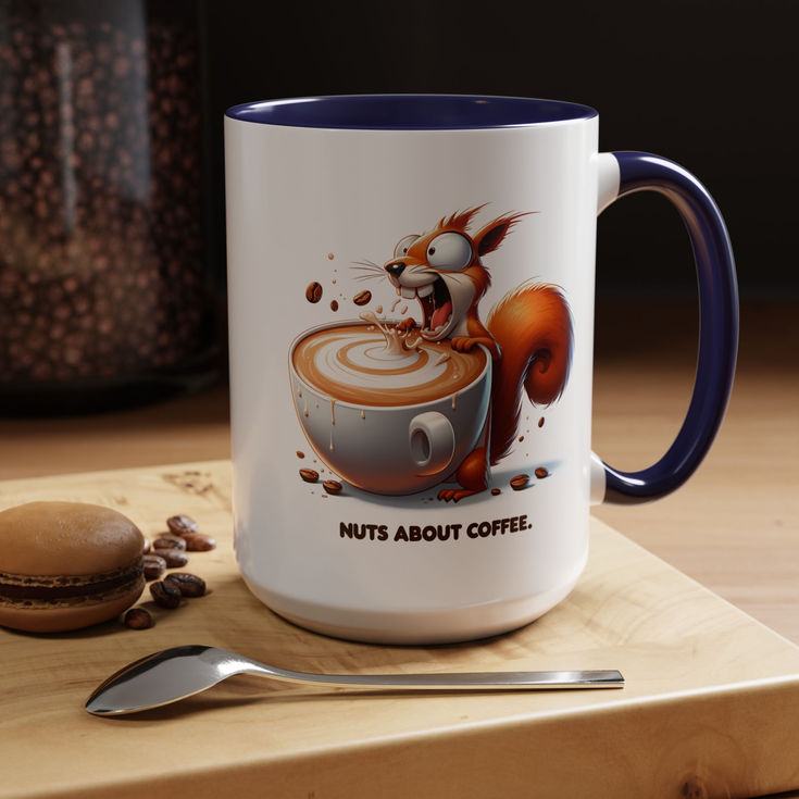 This coffee mug 'Nuts about coffee' is perfect for anyone who loves coffee and wants to showcase their enthusiasm. It boasts vibrant colors, eye-catching color contrast, and a glossy finish. The C-shaped handle and multiple size options make it ideal for daily use or as a gift for coffee lovers. Perfect for holidays, birthdays, or any coffee-related celebration.